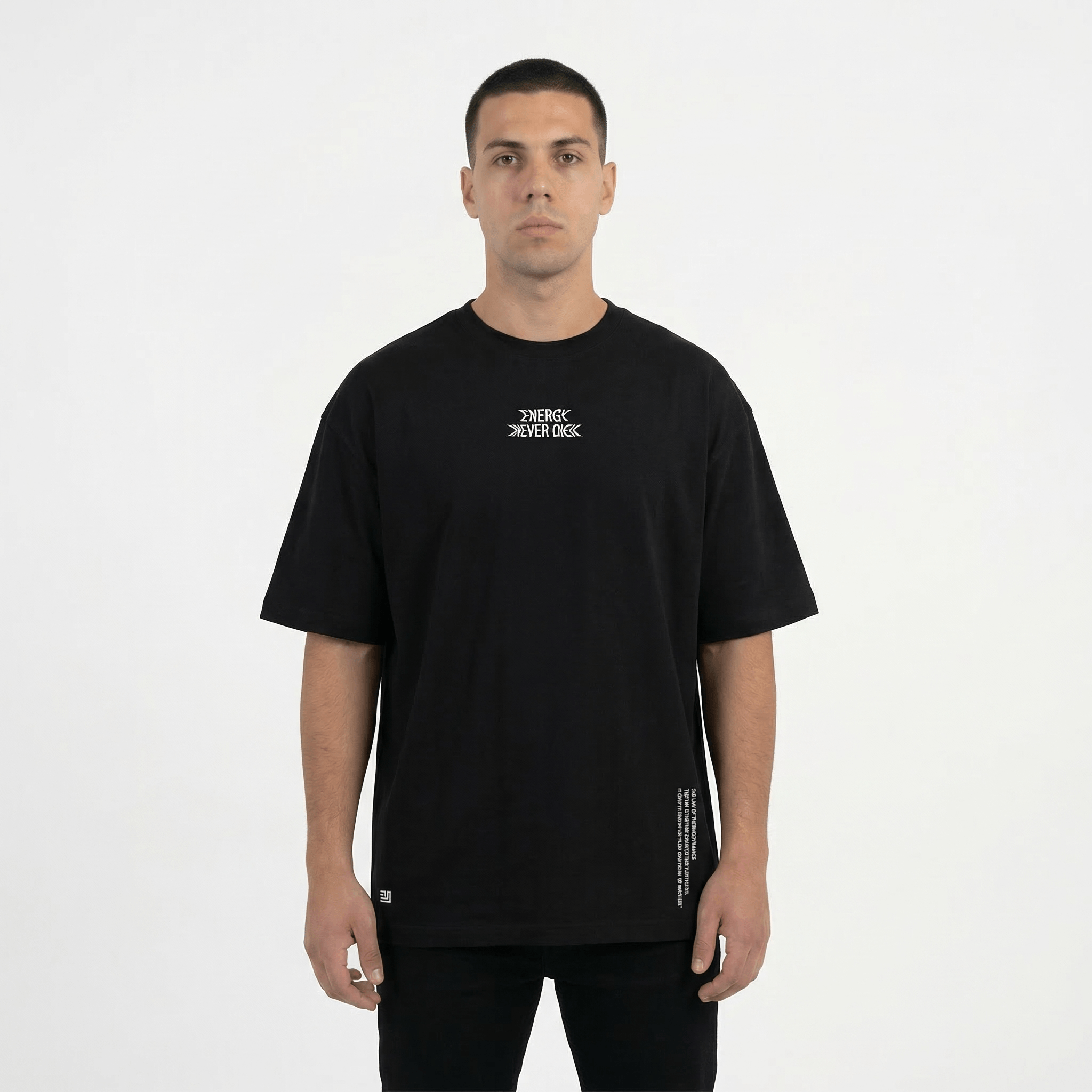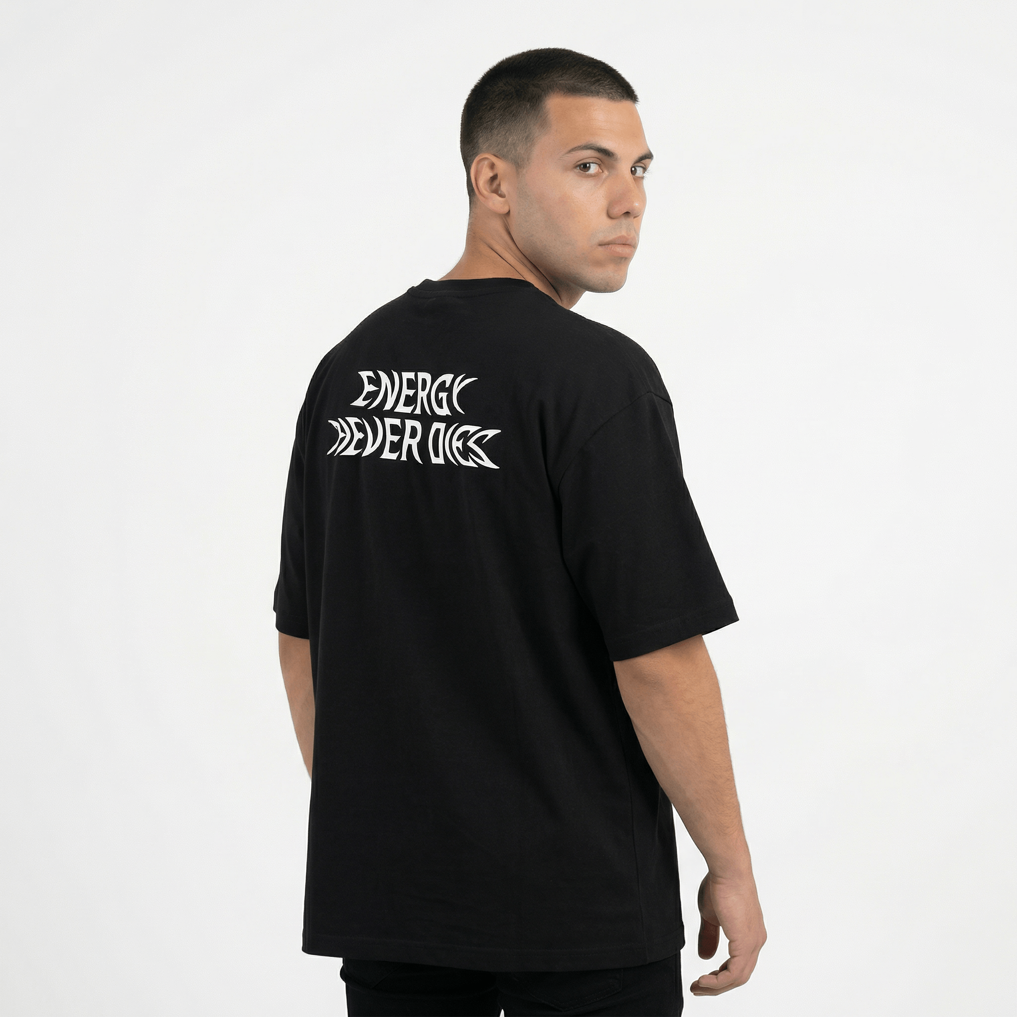 Olvida lo convencional. Esta no es una camiseta oversize negra hombre más. Es el emblema de tu energía interna; la fuerza que te sostiene cuando otros ceden. La ‘Energy Never Dies’ es más que una prenda: es una declaración de principios que se manifiesta en tu espalda.